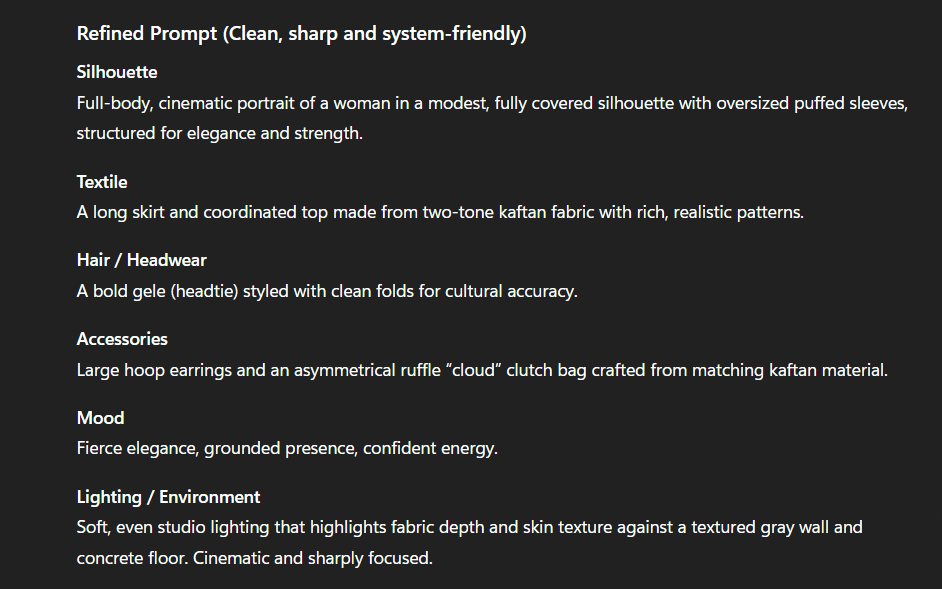 These insights helped me create a more consistent, respectful, and visually strong system for generating culturally grounded fashion visuals.
