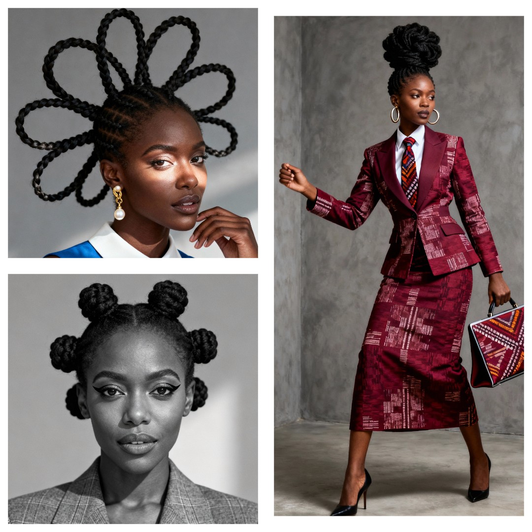 A collage showcasing improved AI-generated Afro-fusion portraits, with clearer fabrics, accurate braided hairstyles, refined silhouettes and more dignified expressions.
