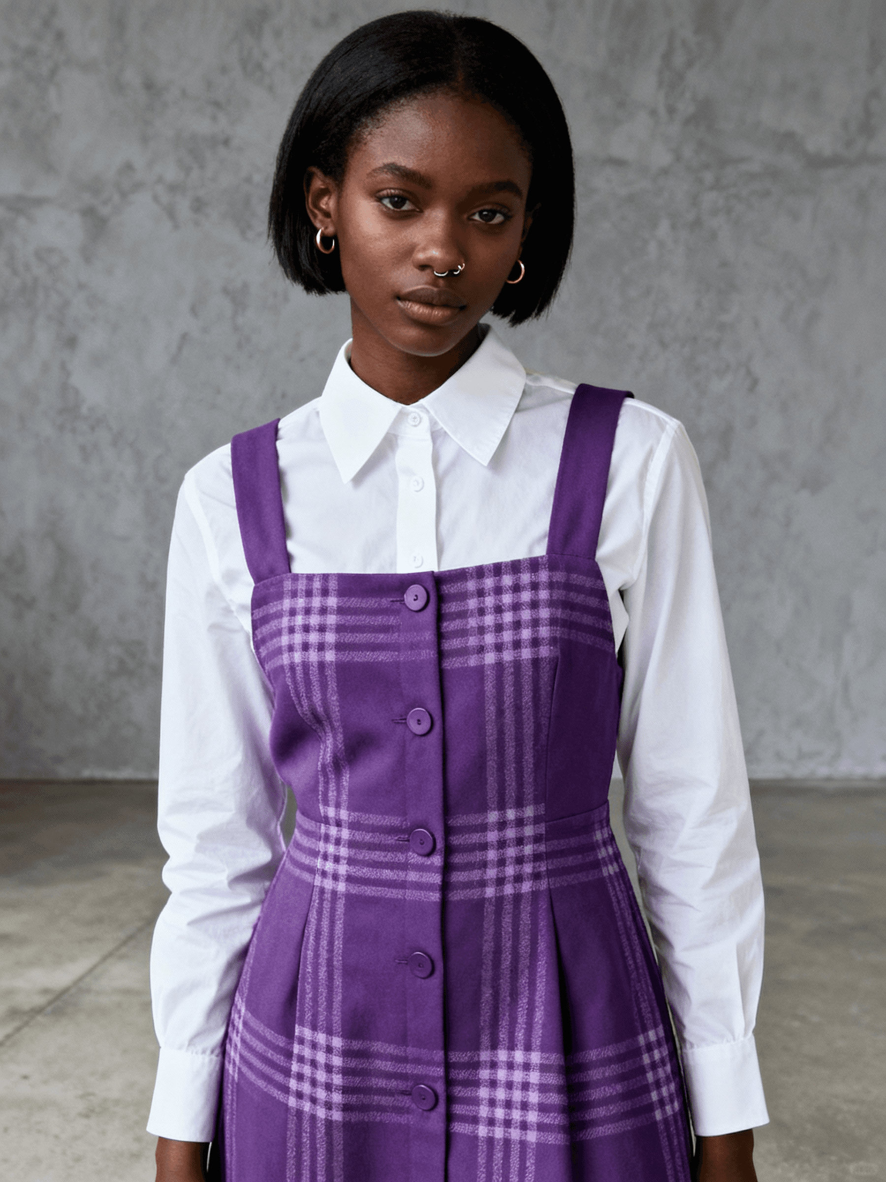 A stylish woman wearing a purple plaid dress layered over a crisp white shirt, accessorized with gold hoop earrings and a subtle nose ring. She stands against a minimalist gray backdrop with soft, even lighting that highlights the textures and clean silhouette.