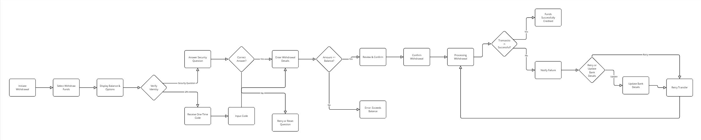 A detailed user flow diagram showcasing the withdrawal process, with key decision points for verification methods and bank detail updates after failed transfers.