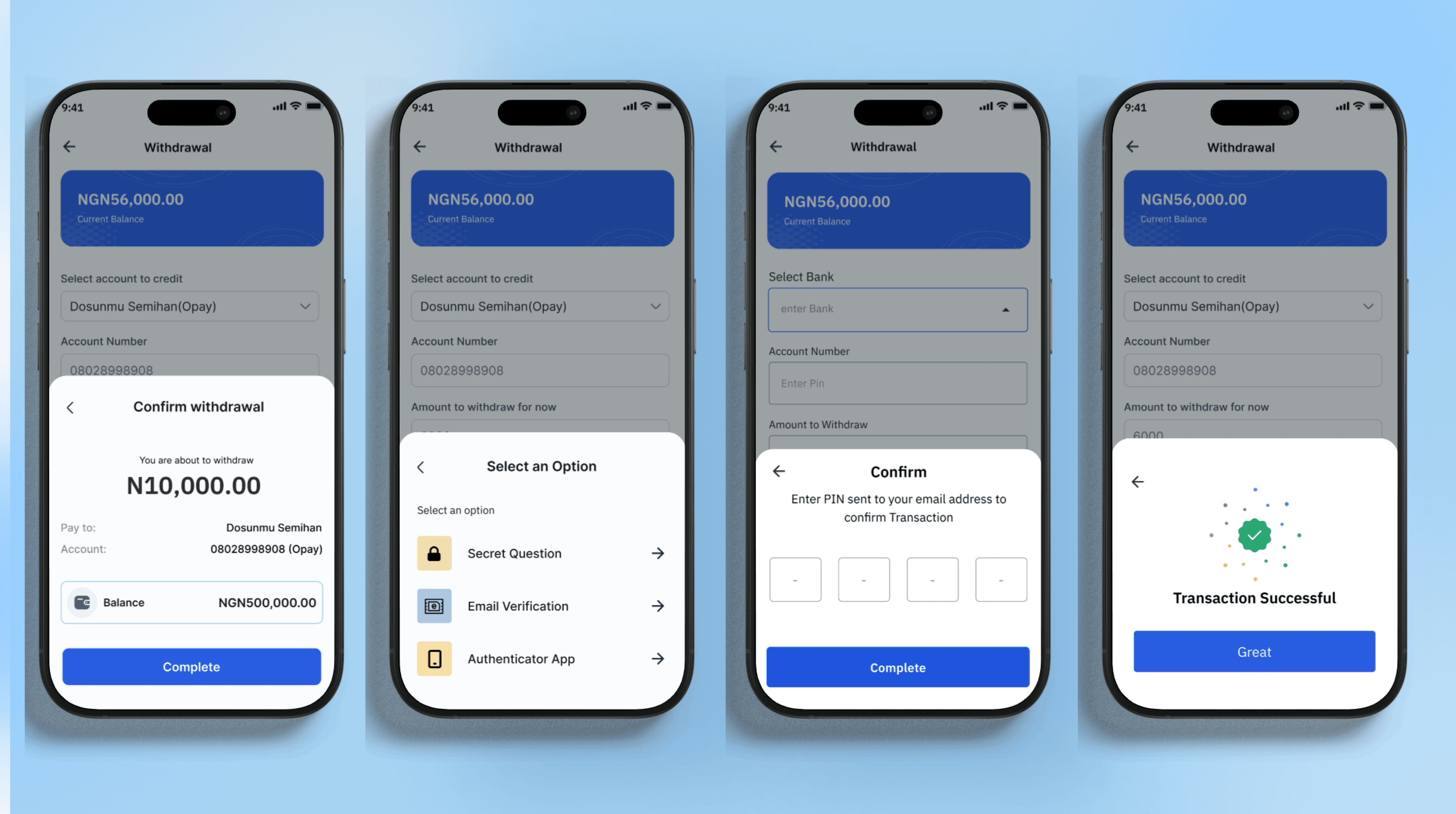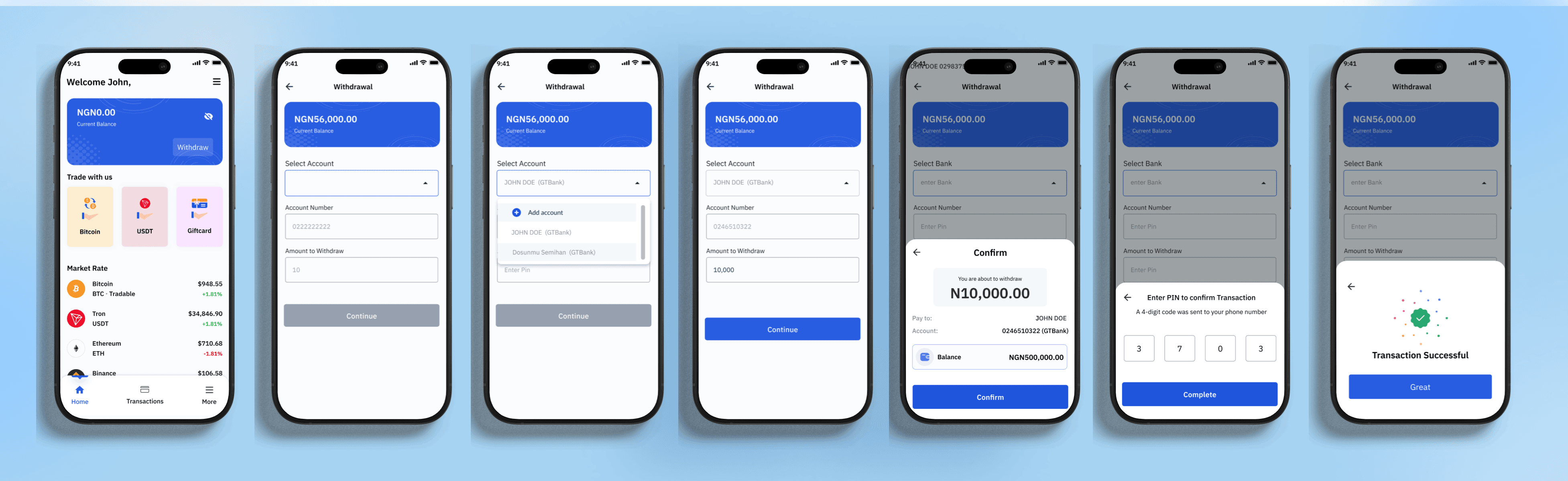 To address the challenges users faced with withdrawals and uncredited bank transfers, I followed a structured, user-centric design process. Drawing insights from my research, I explored multiple design concepts and iterated based on user feedback. My objective was to create a streamlined, secure, and flexible withdrawal system tailored to users' needs and expectations. Key solutions included: