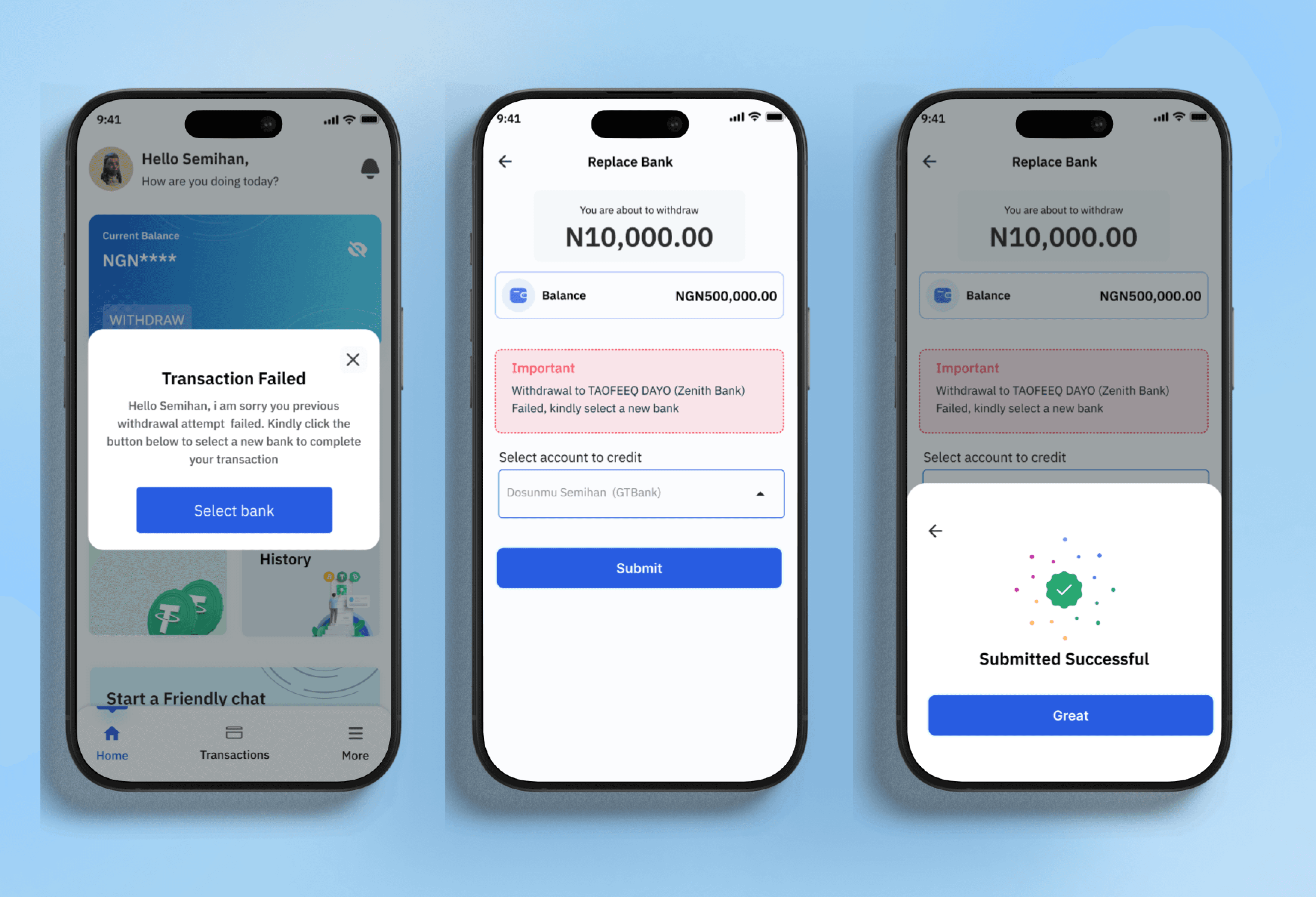 Fallback Mechanism for Failed Transactions: Designed a feature that prompts users to update their bank details quickly when withdrawals fail.