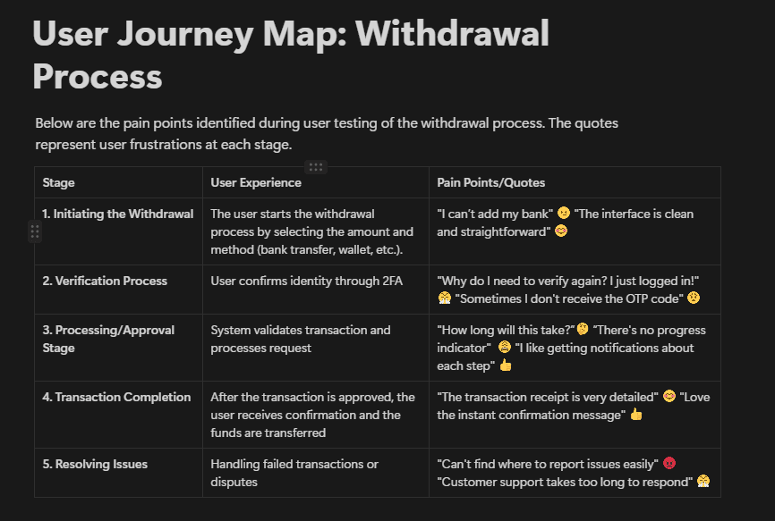 To better understand these pain points, I created a user journey map that outlines the withdrawal process in a fintech app. This map breaks down the process into key stages, visually representing user pain points, emotions, and frustrations using color coding and icons. The insights from this journey map informed solutions that enhanced trust, efficiency, and accessibility within the withdrawal system.